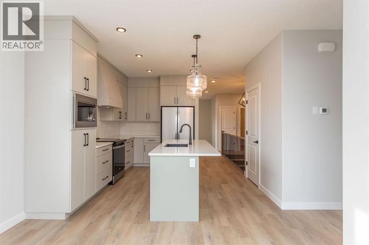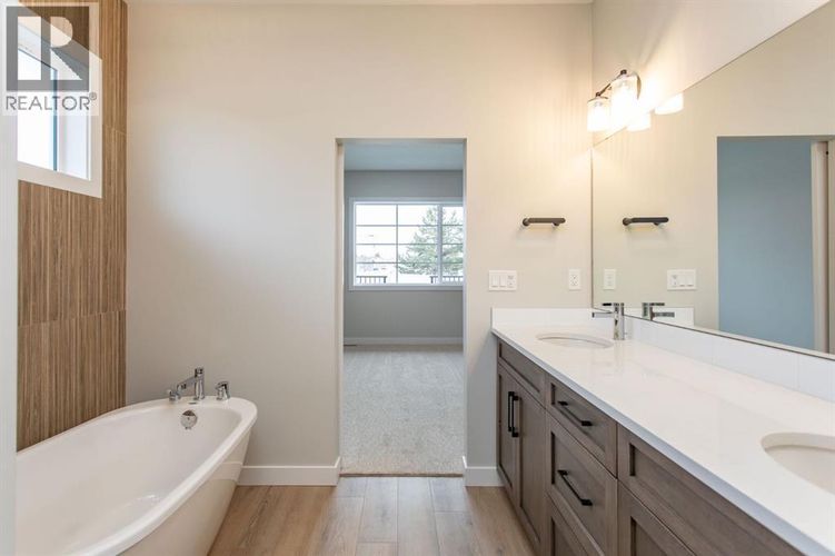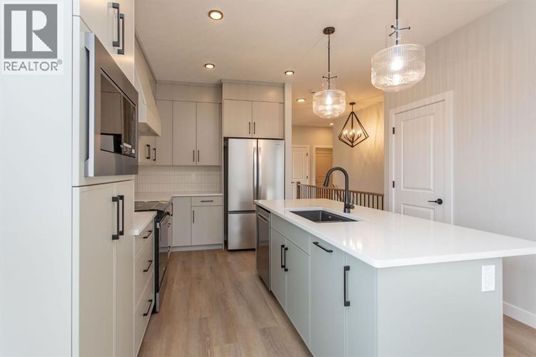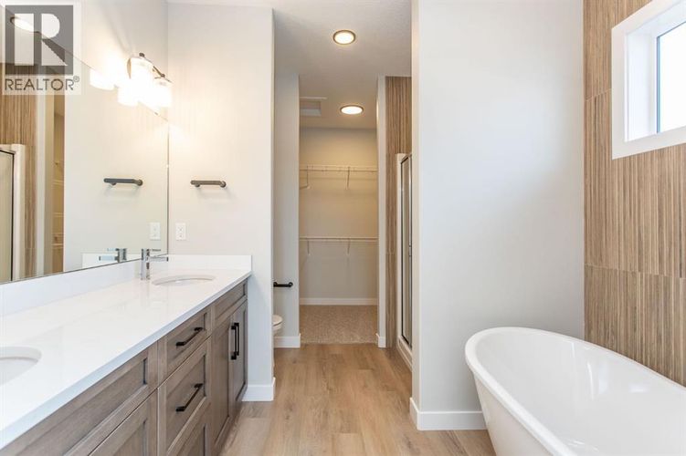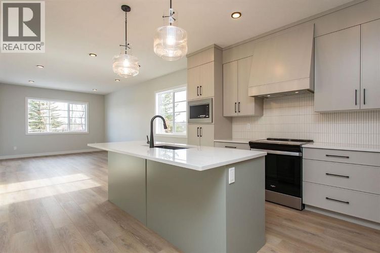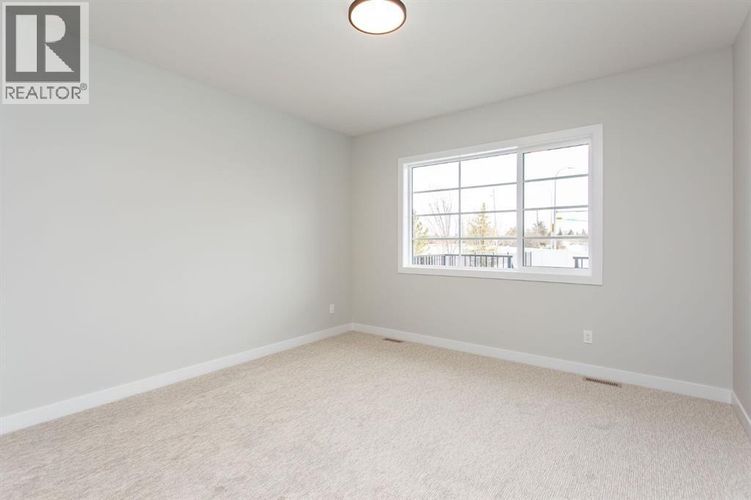 Welcome to maintenance free living in The Timbers, one of Red Deer’s most sought after communities! This stunning community offers executive single family homes that come fully fenced and landscaped, with no restrictions on age or pets, and all of your yard work, mowing, and shovelling in the winter are taken care of for you! This 1339 sq ft home sits on a large pie shaped lot and offers a bright and open concept with 9' ceilings, main floor laundry, vinyl plank flooring throughout the main living space, and a fully finished basement. The two tone kitchen offers raised cabinetry, upgraded stainless steel appliances including an induction range, quartz countertops, large island with under mount granite sink and bar seating, and a large walk-in pantry. The large dining area has plenty of room to entertain with friends, and the adjacent living area offers a garden door leading out to the nicely sized composite deck. The primary bedroom features a large walk in closet and a beautiful spa like ensuite with a freestanding soaker tub, walk in shower, and his and hers sinks. There is also a second bedroom or office space at the front of the home, and a convenient powder room down the hall. The basement is fully finished with a huge rec room area, a third bedroom, and a 4 pce bath, and has also been roughed-in for in-floor heat. Condo fees of $315.51 cover lawn mowing, snow shovelling, and maintenance of common areas. Allowances can be provided for blinds, and a washer and dryer through the builders suppliers to make this a completely move-in ready package. Poured concrete front driveway and landscaping/fencing will be completed as weather permits in 2026. GST is already included in the purchase price, and 1 year builder warranty and 10 year Alberta New Home Warranty are included. Taxes have yet to be assessed. (id:26452)
