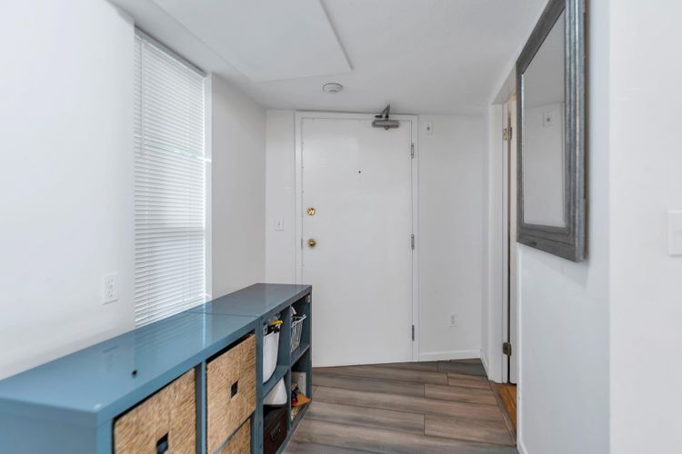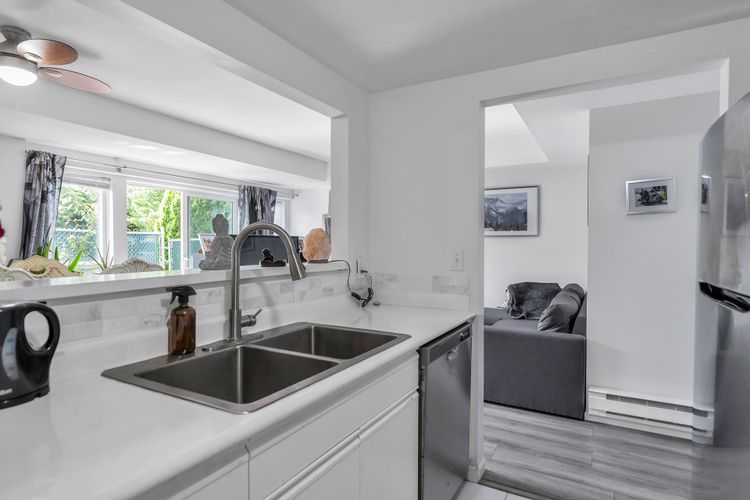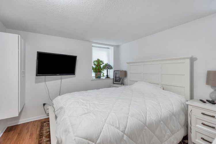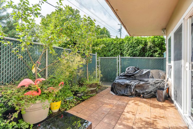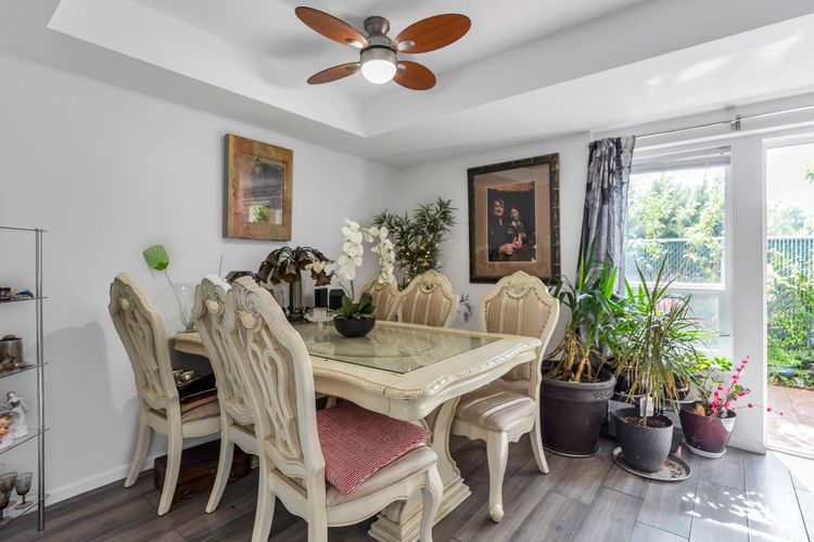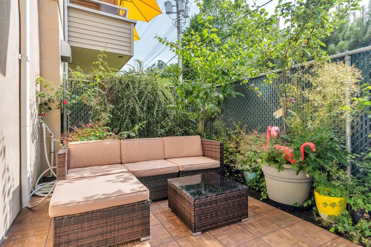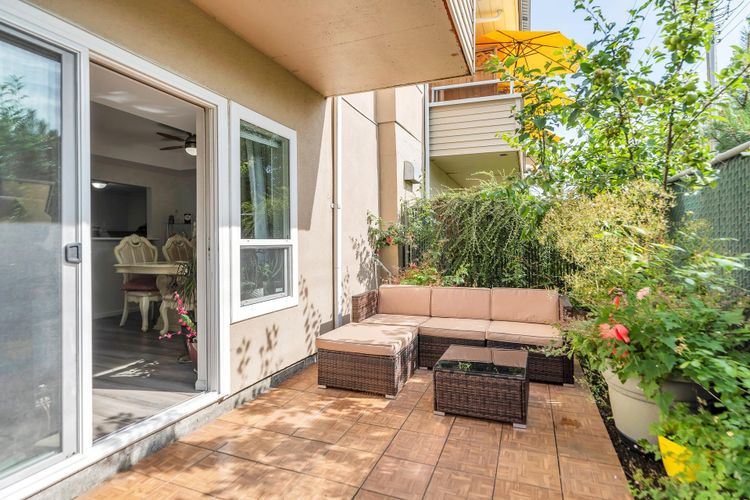 Ground-floor corner unit with 170 sq. ft. private patio + separate entry! This 812 sq. ft. 1 bed + den, 1 bath home in Classic Manor (55+) offers a spacious layout with a large living room, full dining area, in-unit storage room, and wraparound patio - perfect for gardening or relaxing outdoors. No neighbours on either side. Includes secure parking and storage locker (LCP). Quiet, secure building with fob access. Steps to District 1881, shopping, transit, and minutes to Townsend Park, Prospera Centre & Leisure Centre.