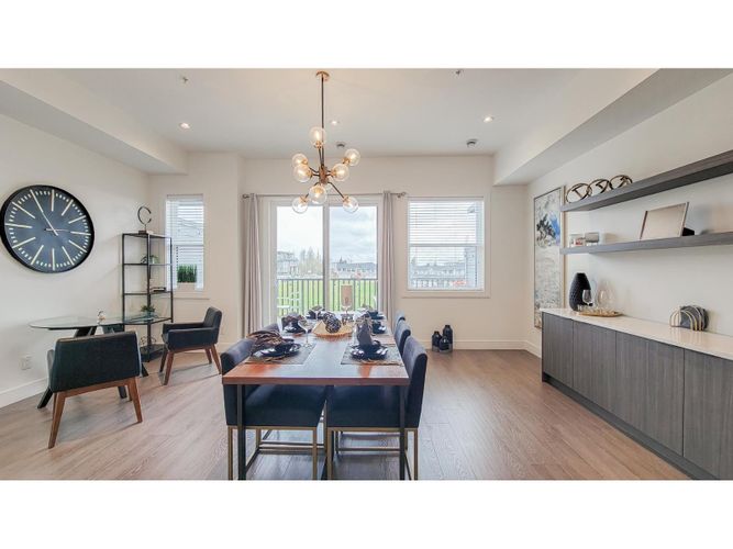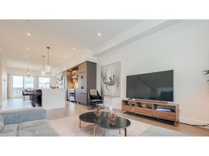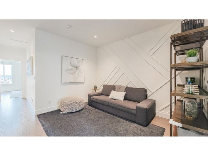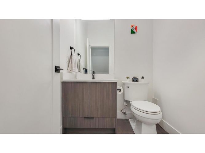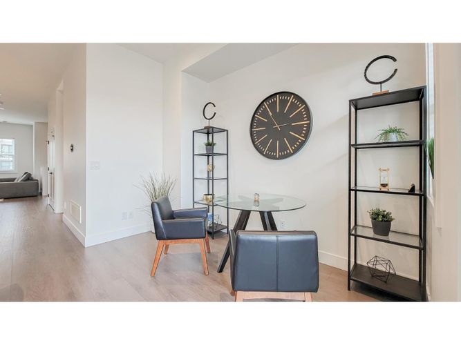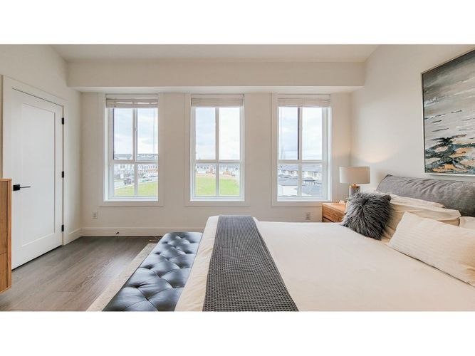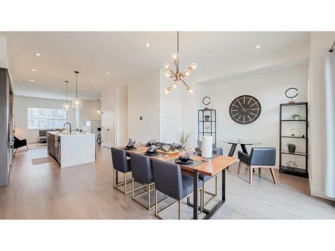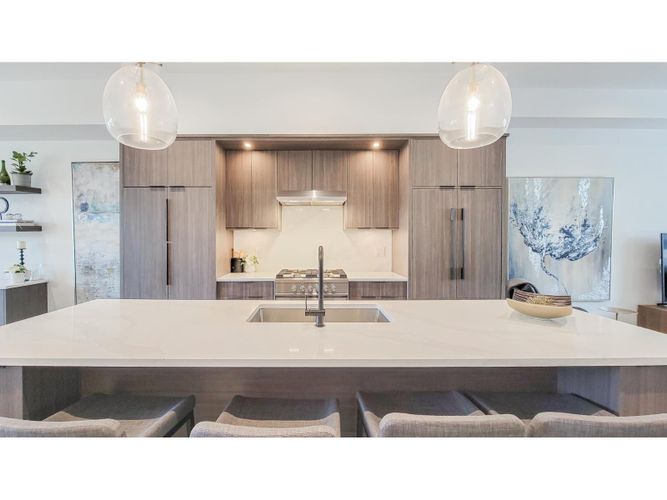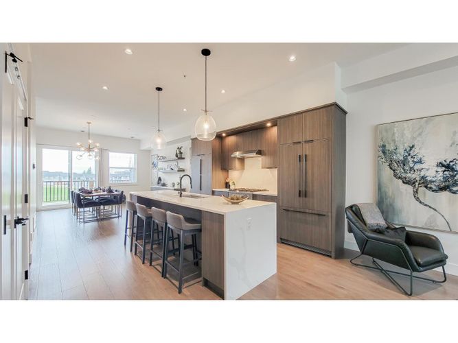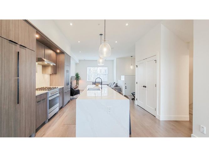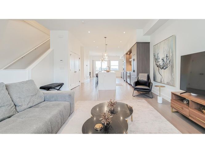 Welcome to this stunning open concept Rowhome with 10ft ceiling on main. This Luxury 2,560 sq.ft. is a former show home designed by Sarah Gallop Design. Offering 4-5 bedroom with premium upgrades, designer furniture, and accessories which the owner is including in the purchase, Gourmet kitchen featuring integrated Fisher & Paykel appliances, a gas range, dual wine coolers, built-in buffet, and a custom credenza. Spacious deck with undisturbed views & BBQ hookup, perfect for entertaining. The Master bedroom with 5-piece spa-inspired ensuite, chandelier, walk-in closets. Lower Level: Ideal for guests or extended family, featuring a bedroom, full bath, wet bar, fridge, and wine rack. Double side by side garage with epoxy finishes, Security & Vac Sys, close to shopping, schools and Hwy 1.
