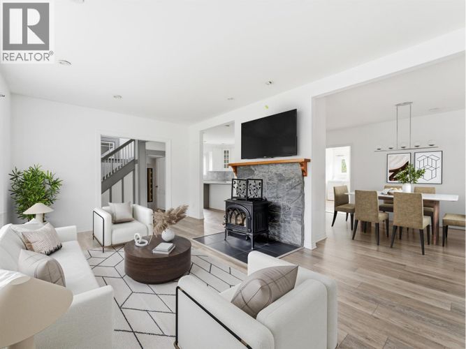 On a nearly 10,000 sqft lot, this stately home boasts mountain views. The main floor features: over-height ceilings; an open concept kitchen/dining area/living rm; laundry rm; bath; + family rm & sitting area w/ gas FP & French doors leading to a covered deck. The updated kitchen includes a Jade gas range, SubZero fridge, stone counters & large island. Above offers a sprawling primary w/ W-I-C & ensuite, 2 beds & bath. Below includes a large rec rm, bath, flex area, storage space, den, & easily suite-area w/ kitchenette & living rm w/ gas FP. The expansive exterior offers established gardens, private yard, carport w/ EV charging. Metres from nature trails, Deer Lake Park, & the city's cultural venues, w/ easy access to transit routes.