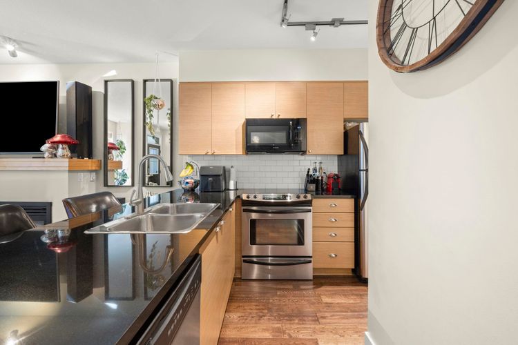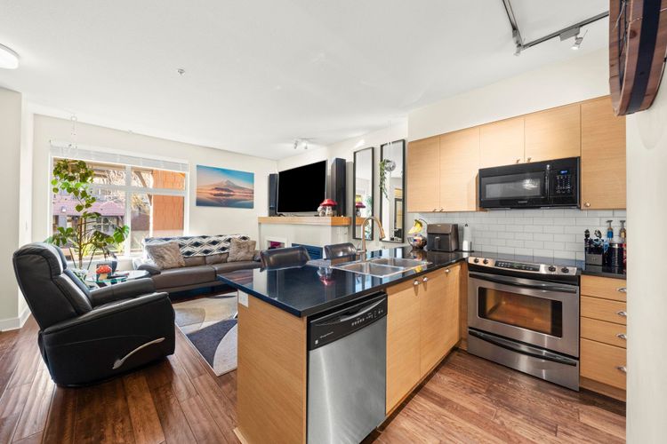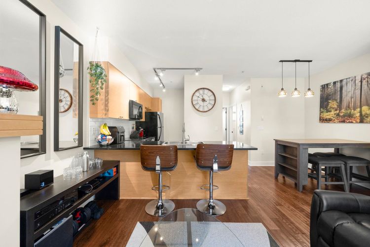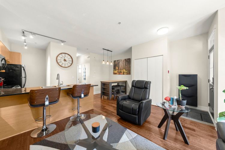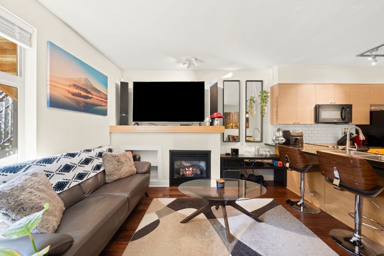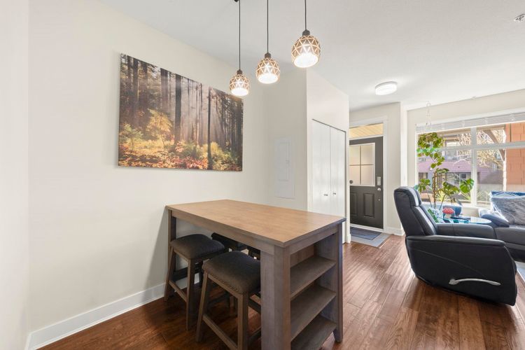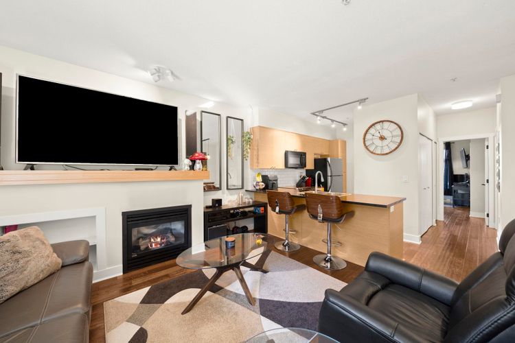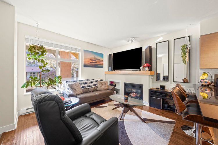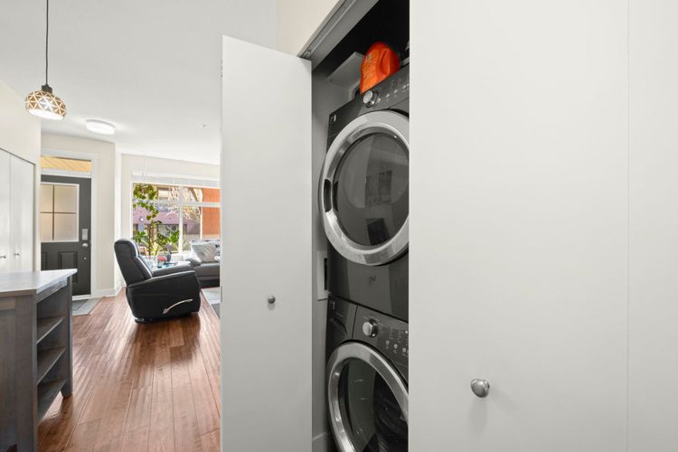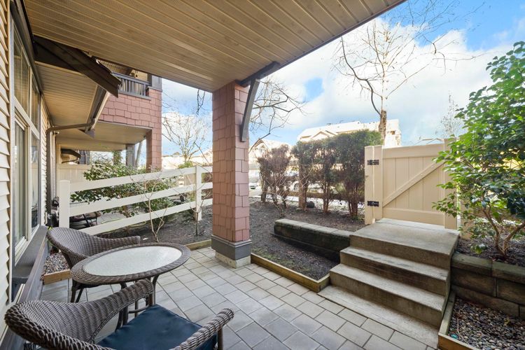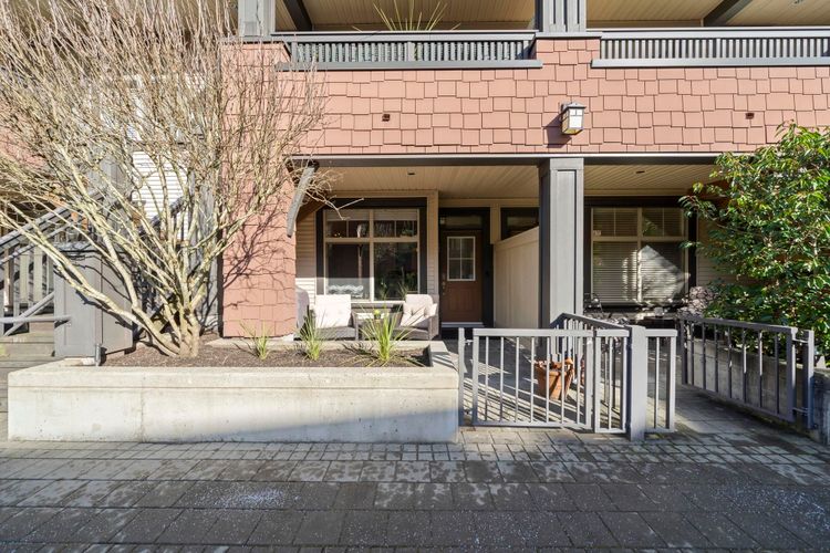Patio lovers must see! Spacious one bedroom townhome by award winning Solterra Group. Great lifestyle with no hallways, your own private entrance. Gourmet kitchen with S/S appliances, granite counters and island with breakfast bar. Living room boasts cozy natural gas fireplace. Master bedroom backs onto patio and has double sinks in ensuite and radiant heated tile floors. 2 generous sized garden fenced patios for outdoor entertaining. One patio has easy acces to sidewalk or the other has inner courtyard exposure, perfect or pet owners or if you cherish your own outdoor space. Full size Washer and dryer included. One parking spot in secure underground parkade plus locker. Low strata fees which includes gas and pro-active council. Call today!