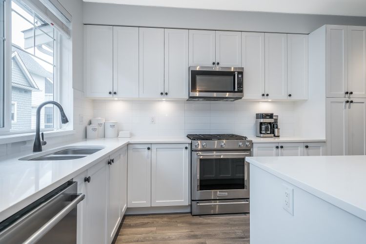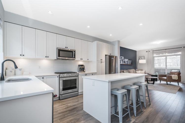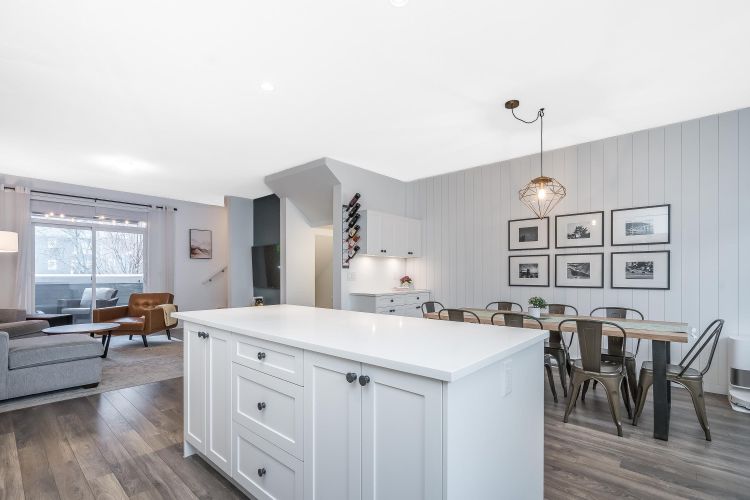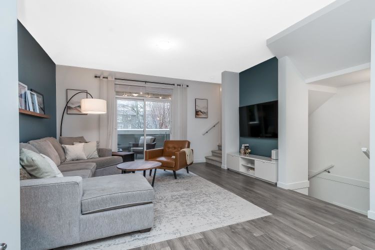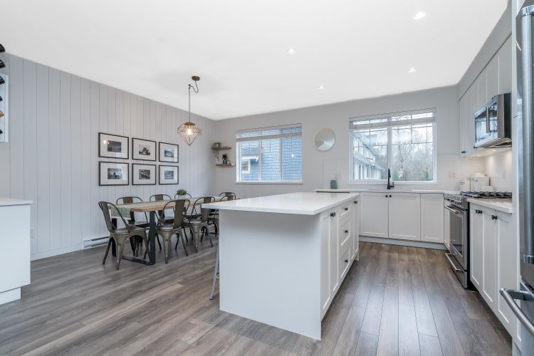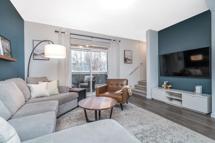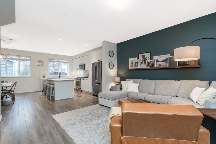 Beautiful 4 bedroom, 4 bathroom townhome built by quality builder Dawson + Sawyer. The main floor features a bright, open-concept living space with a gourmet kitchen complete with stainless steel appliances, high-end finishes, and a large island with breakfast bar. The spacious dining area includes custom millwork and built-ins, offering plenty of room for everyday living and entertaining. Upstairs are three generous bedrooms, including the primary suite with a spa-inspired ensuite. The lower level features a fourth bedroom with its own ensuite, perfect for guests, a home office, or extended family. Enjoy sunsets from the covered balcony year-round or relax in the private fenced backyard backing onto a beautiful tree-lined greenspace with western exposure. Rare side-by-side double garage.
