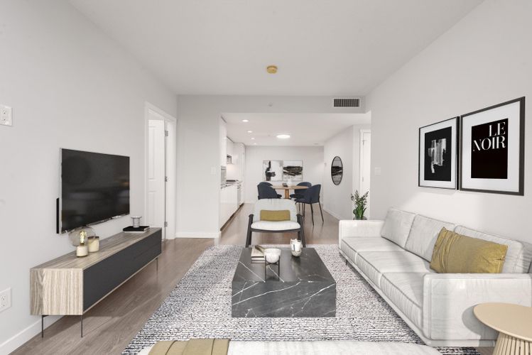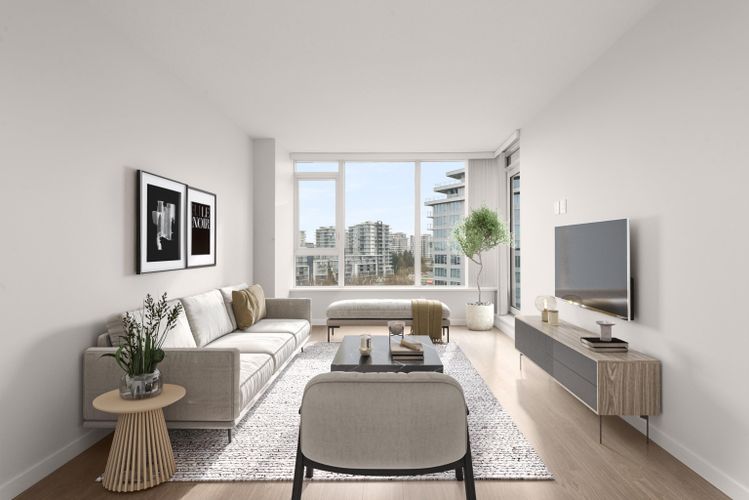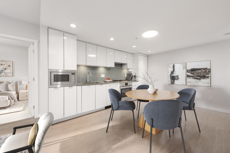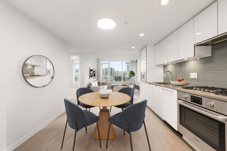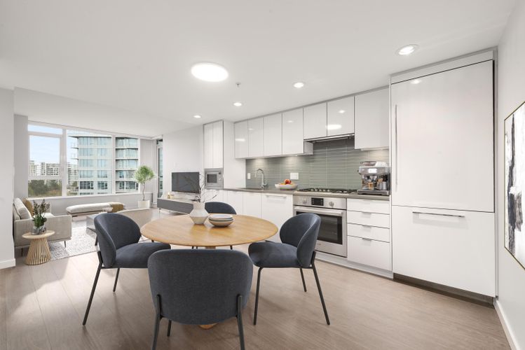 Avanti by Polygon. Bright and well-appointed 2 bed, 2 bath home offering 878 sq.ft. overlooking the peaceful inner courtyard. The functional layout maximizes space for comfortable everyday living and easy entertaining. Enjoy year-round comfort with A/C and large windows that bring in abundant natural light. Residents have exclusive access to the 8,000 sq.ft. Avanti Club featuring a fully equipped fitness centre, outdoor pool/hot tub, yoga studio, games room, media and gaming lounge, music/recording studios, rooftop deck, social lounge, and the signature Blue Sky Lounge. Conveniently located within walking distance to Capstan and Aberdeen SkyTrain stations. Situated directly across from Aberdeen Neighbourhood Park—perfect for relaxing walks and enjoying the surrounding green space.