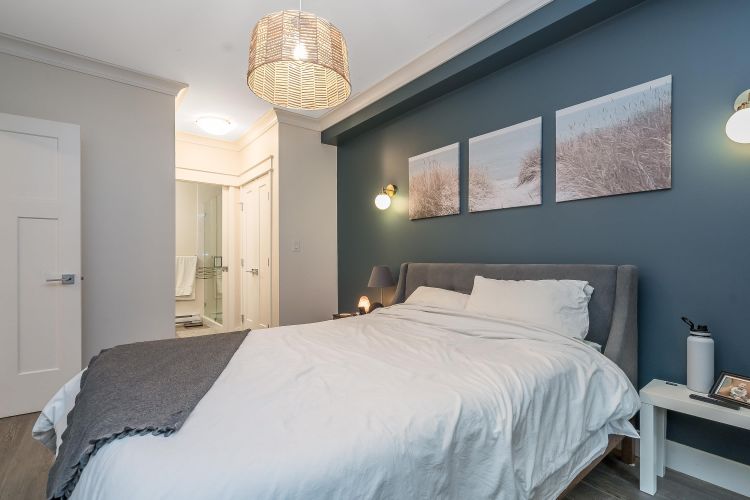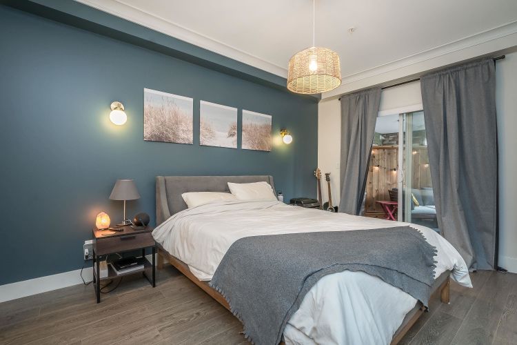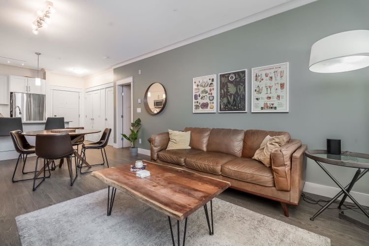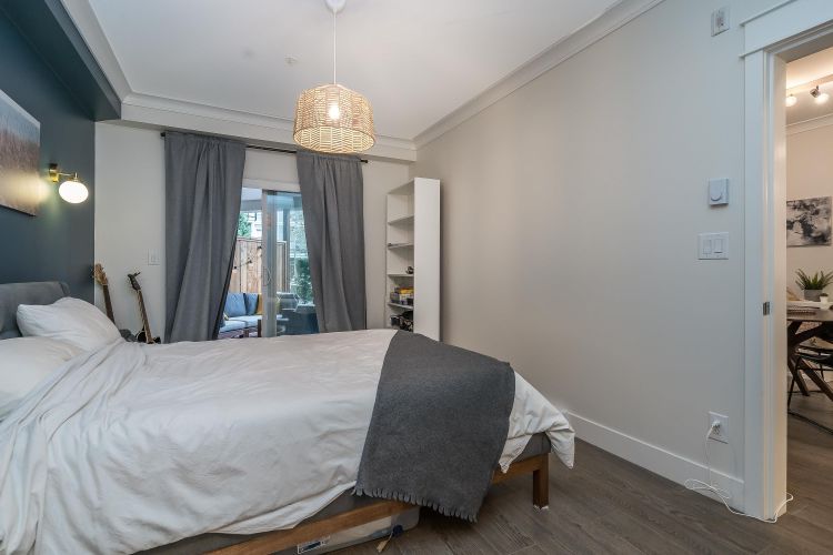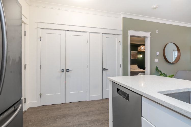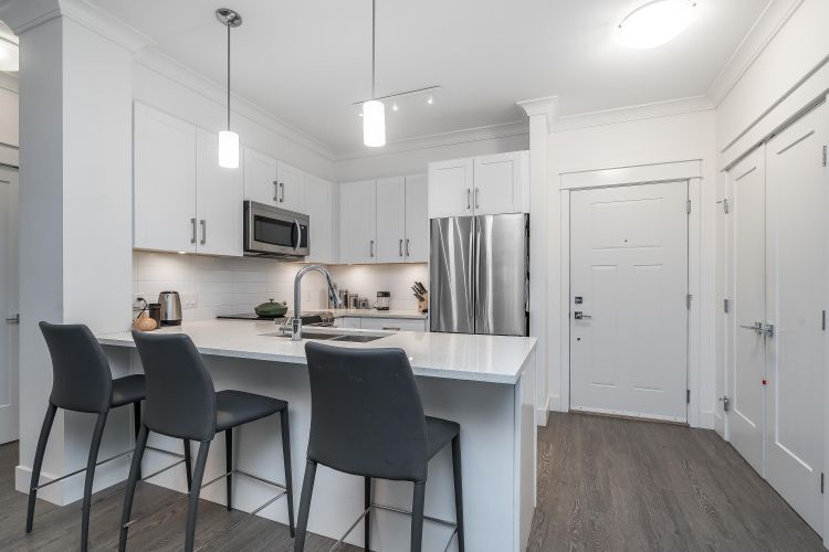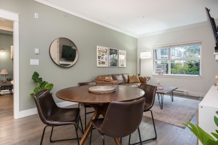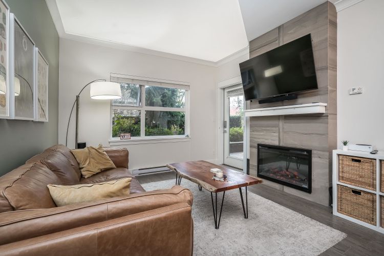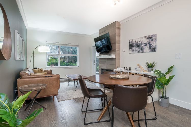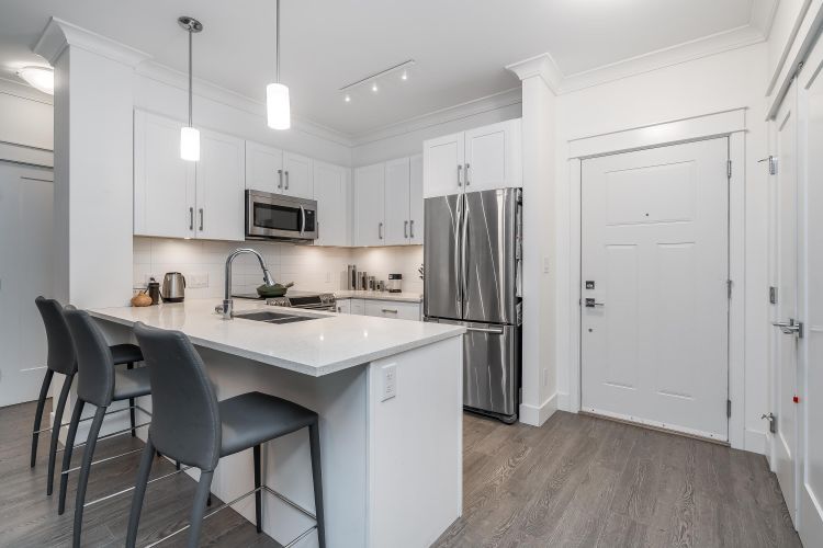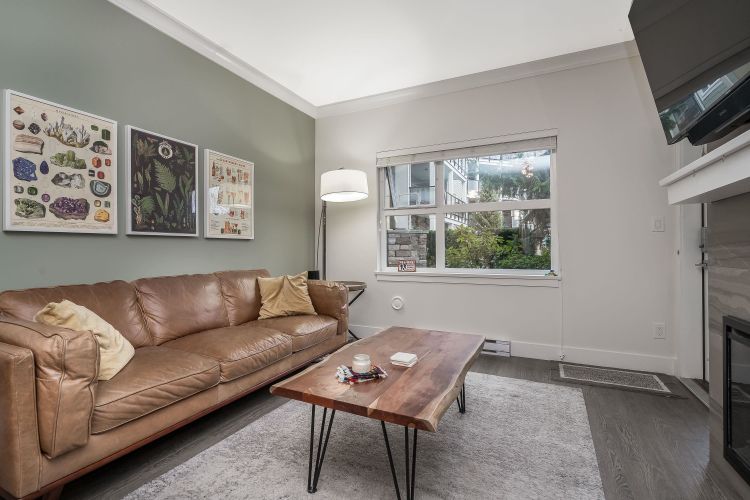 Welcome to this beautifully appointed ground-floor, courtyard-facing 2 bed, 2 bath home offering 881 sq. ft. of comfortable and well-designed living space. Featuring a superior level of finishings, including sleek stainless steel appliances, solid quartz countertops, shaker-style cabinetry, wood flooring, crown mouldings, and extensive wood trim. Enjoy seamless indoor-outdoor living with two private patios, perfect for relaxing or entertaining. Residents are surrounded by a central courtyard with a lavish water feature, tranquil seating areas, and private walkways. Complete with 1 parking stall and 1 storage locker.