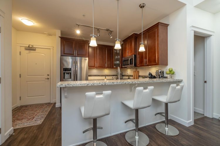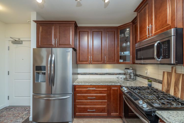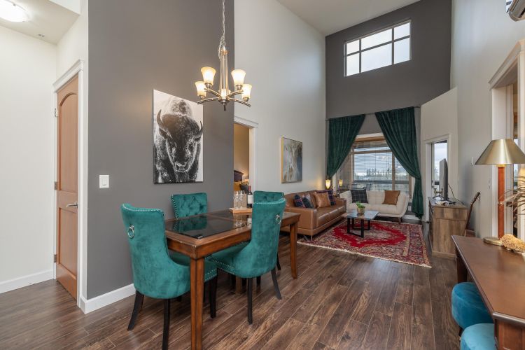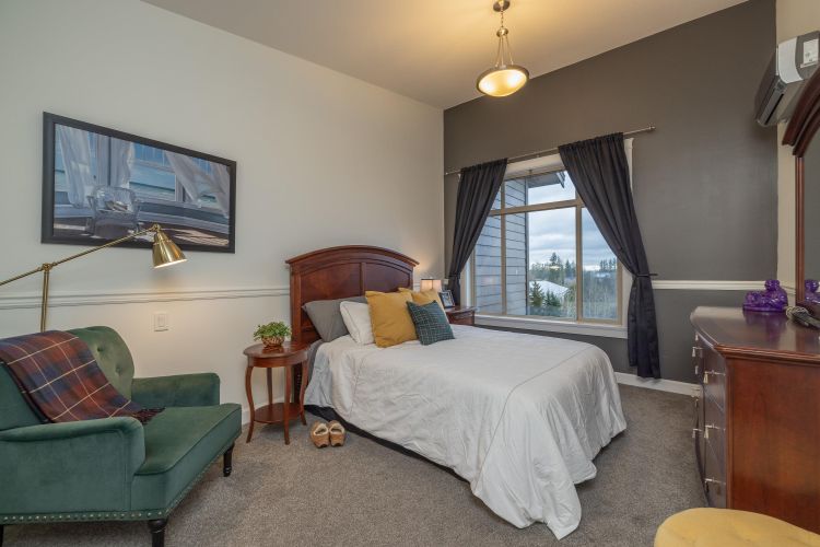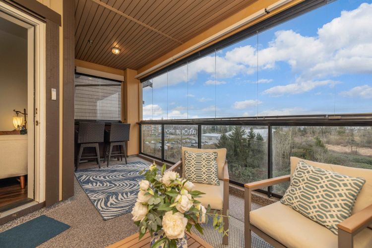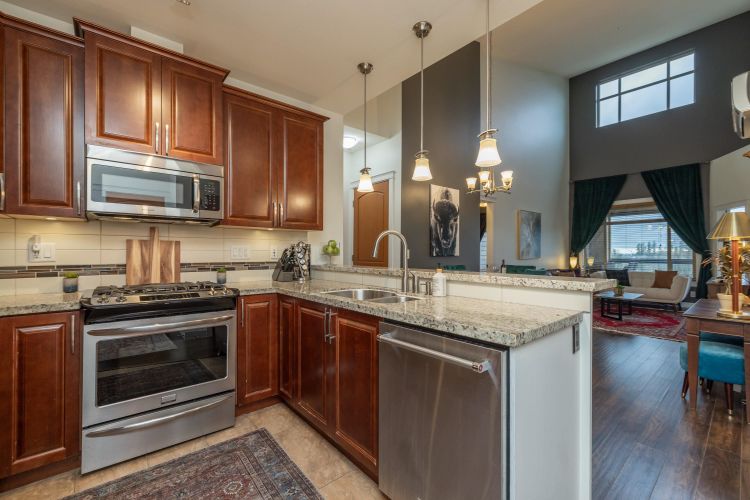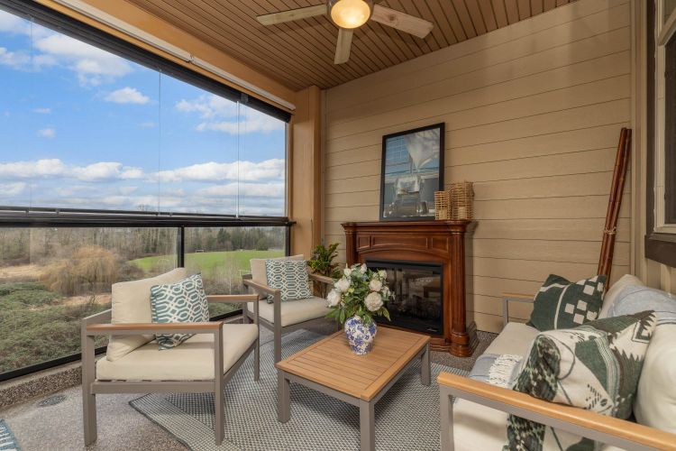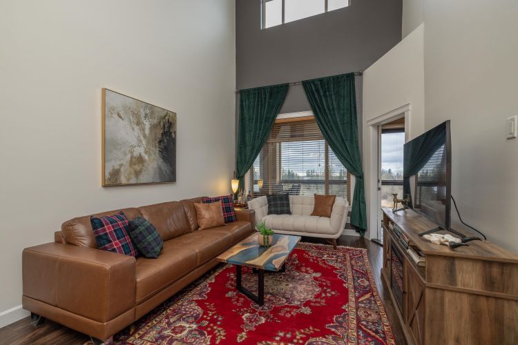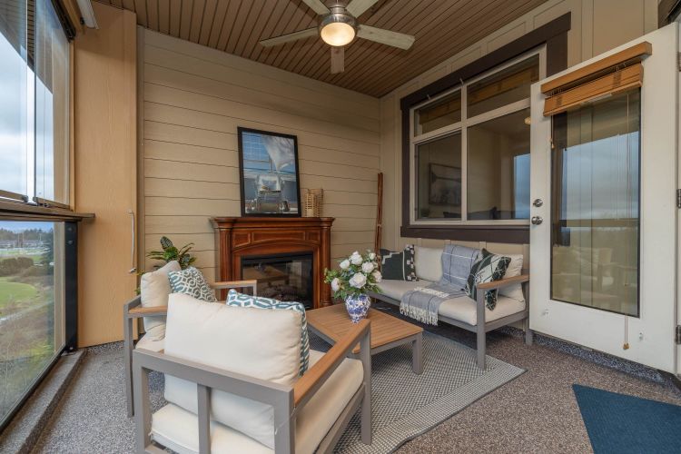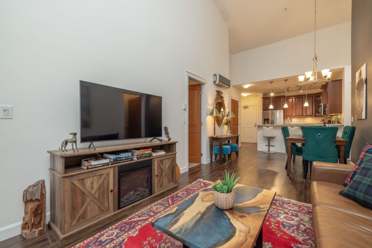 This gorgeous PENTHOUSE is a SHOW-STOPPER! Rare to market! Enjoy expansive views & privacy in this 3 bedroom, 2 bath home as it impresses with soaring 20' ceilings, abundant natural light & elevated finishes throughout. Kitchen features granite countertops, warm wood cabinetry, SS appliances, & gas stove. Warm your tootsies on heated bathroom floors. A/C provides year-round comfort from summer heat. Spacious primary bedroom easily accommodates a king bed plus furniture. Large enclosed solarium w/ retractable windows offers unobstructed field & mountain views - perfect for sunset evenings. 2 PARKING & 2 LARGE ROLL-UP storage lockers (one w/ power!). Low fees, gas & hot water. OPEN HOUSE: MARCH 21 (SAT): 1-3PM