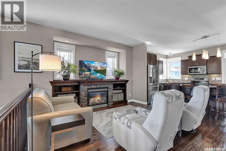 Welcome to this pristinely maintained 1,103 sq ft bi-level in Regina’s desirable Lakeridge Addition, backing onto beautiful greenspace. This home offers 4 bedrooms, 3 bathrooms, and a double attached garage, providing an ideal layout for families. The spacious front foyer welcomes you with direct access to the garage. The main living area features hardwood flooring and a bright living room highlighted by a natural gas fireplace with built-in cabinetry. The kitchen is both stylish and functional with granite countertops, a large island that doubles as a dining table, tiled backsplash, stainless steel appliances, pantry, and corner windows over the sink. A convenient central vac sweeper in the kitchen makes cleanup effortless. Patio doors off the kitchen lead to the maintenance-free deck complete with a sunshade, privacy screening, and peaceful views of the greenspace. The fully fenced yard is beautifully landscaped and includes underground sprinklers for easy maintenance. The primary bedroom is generously sized with plush carpeting, a walk-in closet (7' x 8'5"), and a 3-piece ensuite featuring quartz countertops and a tiled shower. A second bedroom and a conveniently located 4-piece bathroom complete the main floor. The fully developed basement offers a large, bright family room thanks to oversized windows, two additional good-sized bedrooms, a laundry area with ample storage, and a versatile nook ideal for a play area, home office, or workout space. (id:26452)