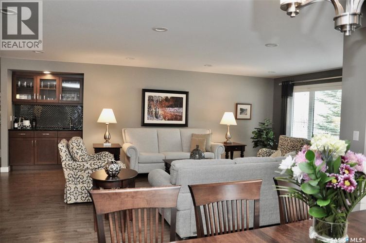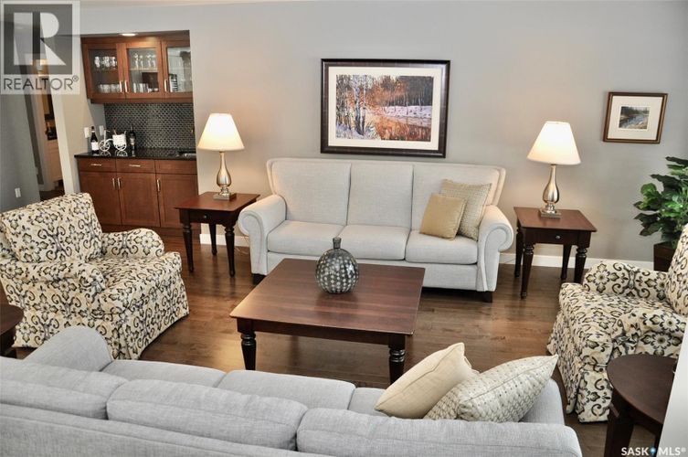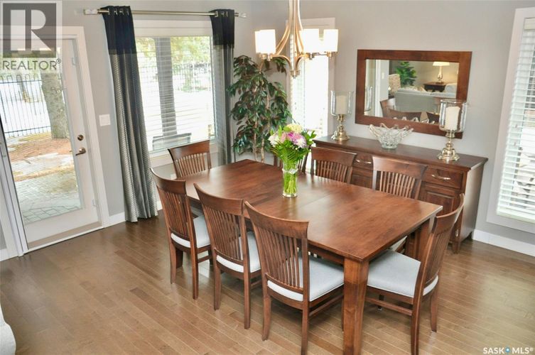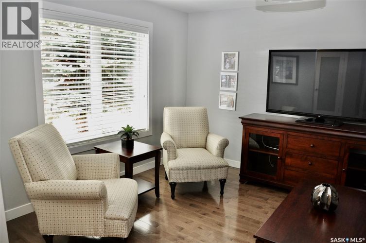 Welcome to one of Saskatoon's first and most desirable gated communities .....Heritage Estates. This original owner home still shows like the the day it was rebuilt after a major fire destroyed three units within the complex in 2013. This totally redesigned 1947 square foot bungalow townhouse was rebuilt by "Legacy Homes" in 2014 and offers spacious rooms thru out from the gleaming hardwood floors to the bright kitchen with granite counter tops, tile backsplash and high end appliances. The main floor is ideal for entertaining guests and family with the large open living room featuring dry bar and dining room that will easily sit 10 people The primary bedroom has built in cabinetry, large picture window overlooking natural treed area and has a beautiful ensuite with separate tub and shower. Also features a main floor den area currently set up as TV room, second large bedroom and direct entry from double attached garage to mudroom laundry room conveniently located off the front foyer. The outdoor area features a large interlocking brick patio to enjoy your morning coffee and relax and take in views. This complex also includes a Club house, outdoor pool and hot tub, tennis / pickle ball courts and putting green.....truly a great place to call home! Call your Realtor today for private viewing. As per the Seller’s direction, all offers will be presented on 03/23/2026 10:30AM. (id:26452)